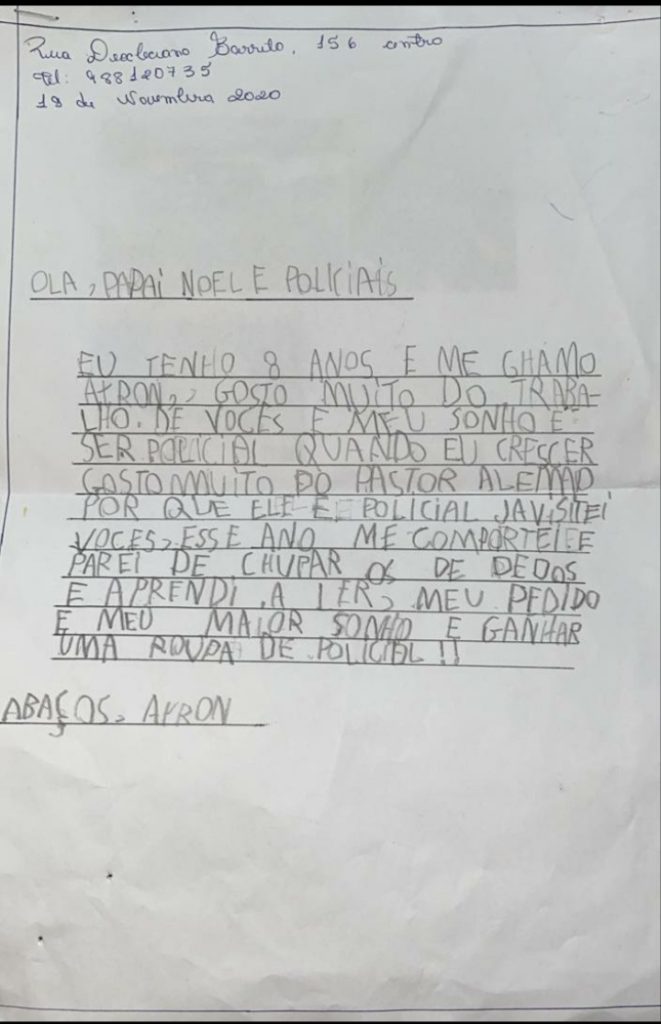 Com a carta em mãos o BPRv fez transformar o sonho em realidade do garoto Ayron, 08 anos, que recebeu de presente um uniforme mirim da instituição.