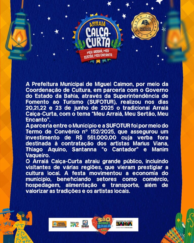 A Prefeitura Municipal de Miguel Calmon, por meio da Coordenação de Cultura, em parceria com o Governo do Estado da Bahia, através da Superintendência de Fomento ao Turismo (SUFOTUR), realizou nos dias 20, 21, 22 e 23 de junho de 2025 o tradicional Arraiá Calça-Curta, com o tema “Meu Arraiá, Meu Sertão, Meu Encanto”.