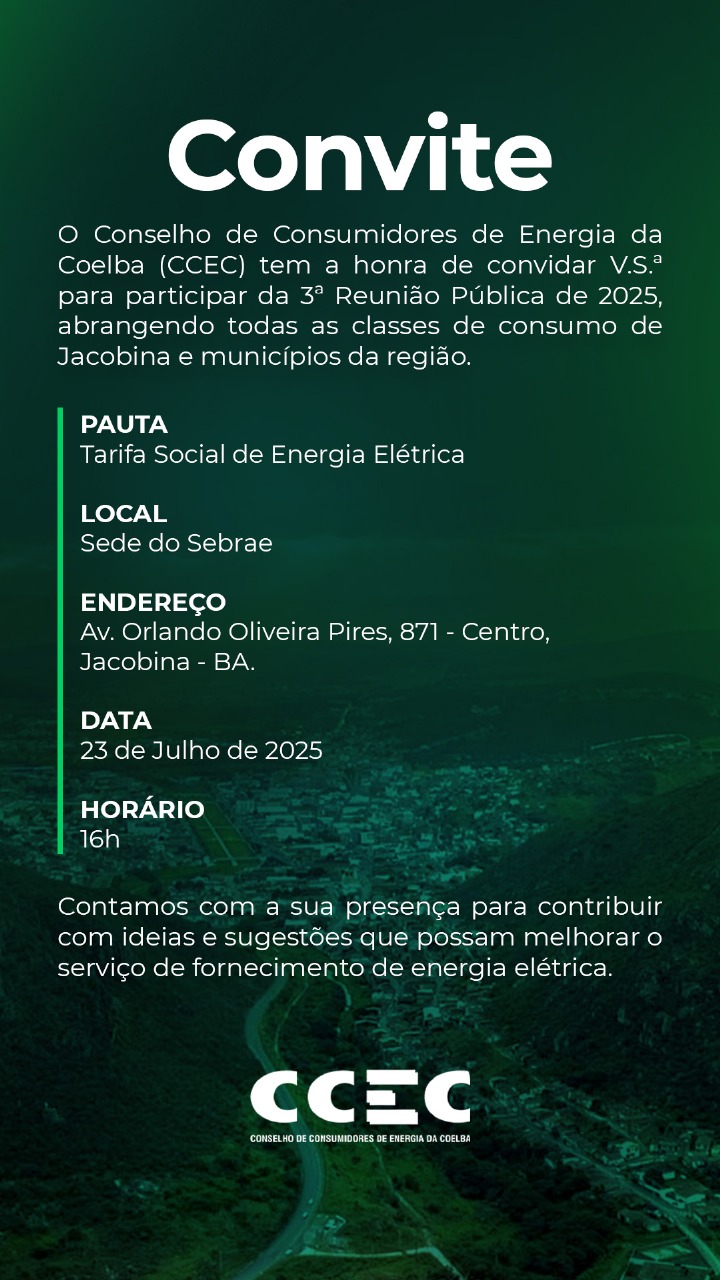 O Conselho de Consumidores de Energia Elétrica da Bahia (CCEC) realizará sua 3ª reunião pública, no próximo dia 23, na sede do Sebrae, às 16h, na cidade de Jacobina. Com o objetivo de discutir os aspectos relacionados à distribuição de energia elétrica através da Neoenergia Coelba e à nova regra da Tarifa Social da conta de luz.