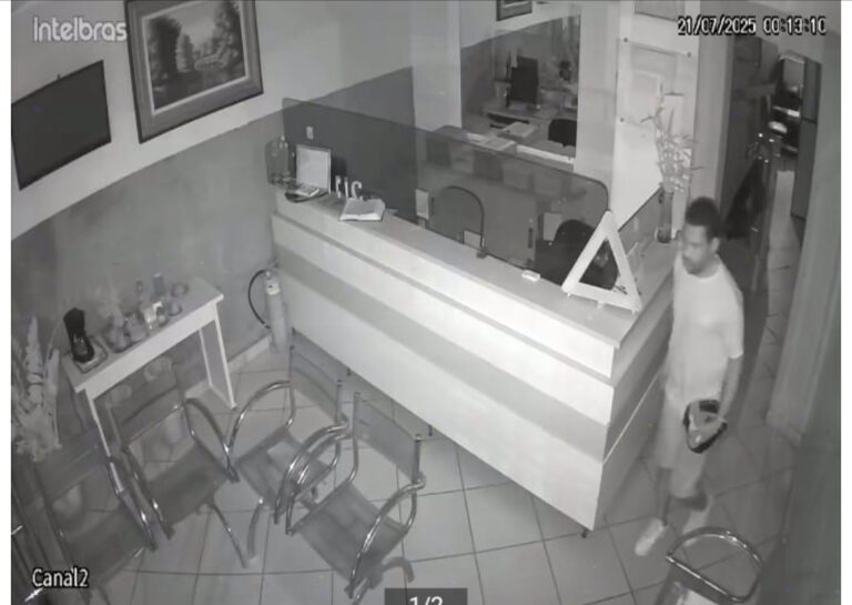 As imagens do criminoso realizando a ação foram filmadas em tempo real pelo circuito interno da empresa. Ele trajava uma blusa vermelha e está sendo procurado pela Polícia Civil.