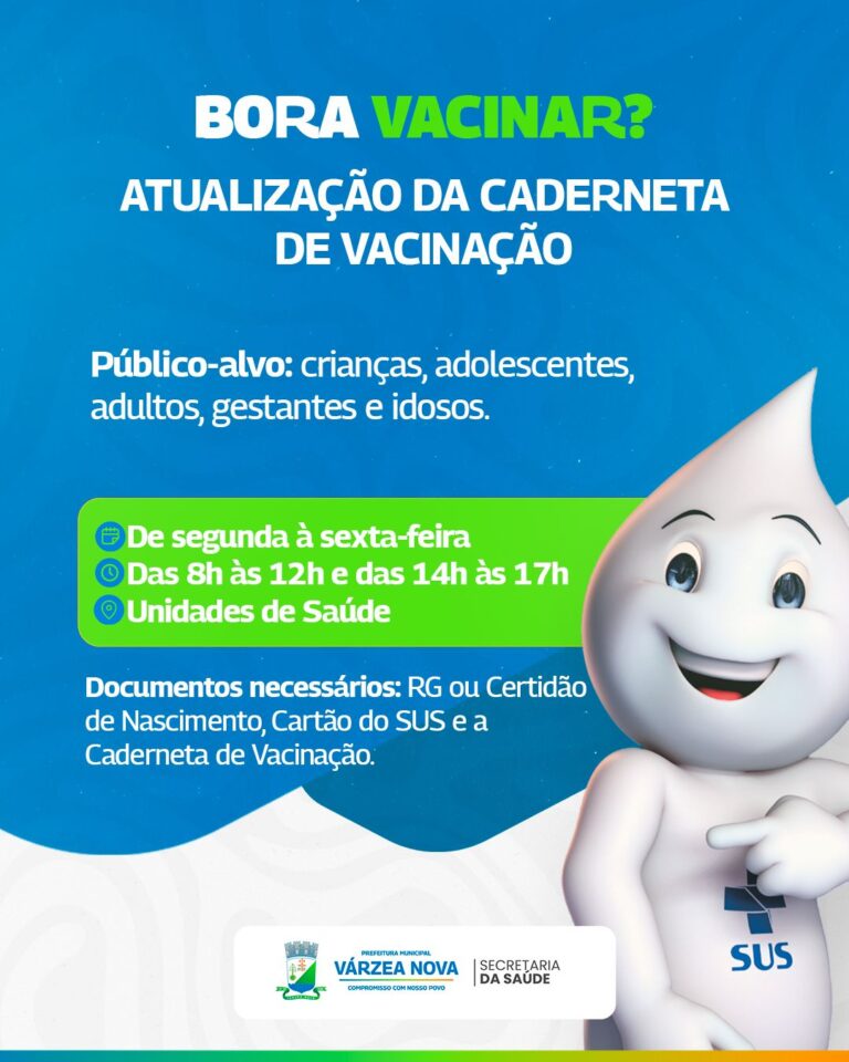 A Prefeitura de Várzea Nova, por meio da Secretaria de Saúde, iniciou uma campanha de atualização da caderneta de vacinação voltada para todas as faixas etárias da população. A ação ocorre de segunda a sexta-feira, das 8h às 12h e das 14h às 17h, nas Unidades de Saúde do município.