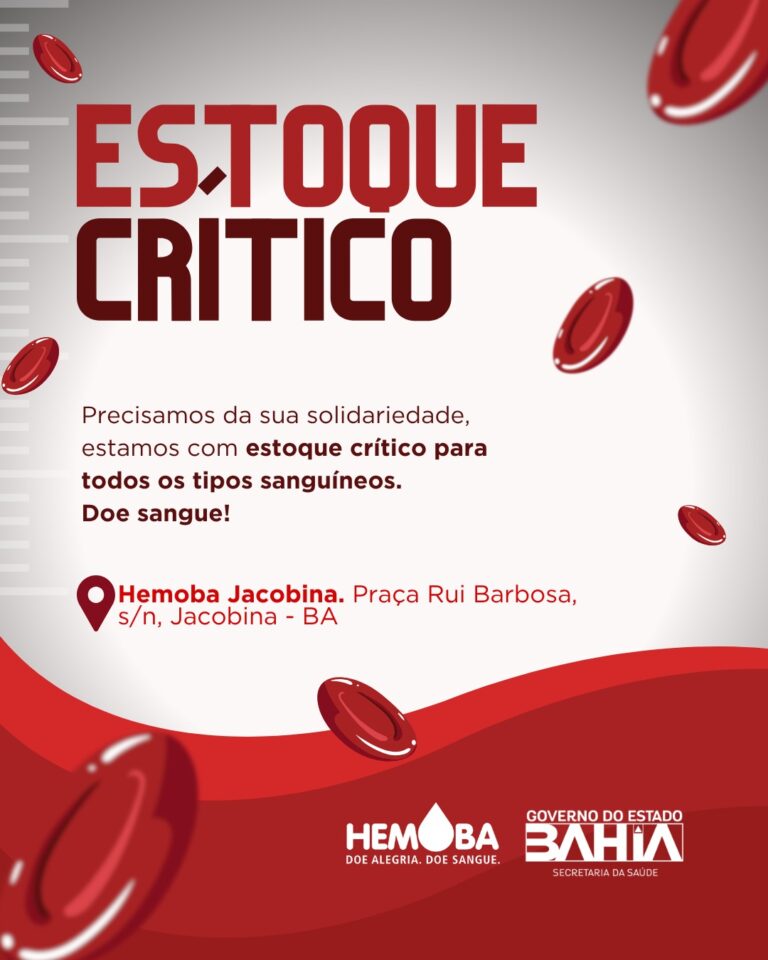A Fundação Hemoba de Jacobina está precisando de doadores de todos os grupos sanguíneos, principalmente do O positivo e negativos. As coletas ocorrem todas as manhãs, das 8h às 12h.