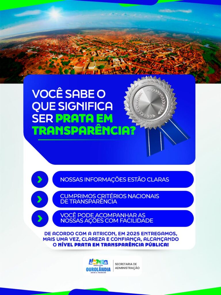 A Prefeitura de Ourolândia anunciou oficialmente a conquista do Selo Prata em Transparência Pública, reconhecimento nacional que mede o nível de abertura, clareza e qualidade das informações disponibilizadas ao cidadão. O resultado, divulgado pelo Radar de Transparência Pública da Atricon, demonstra o avanço contínuo do município na modernização da gestão e no acesso à informação, garantindo que a população possa acompanhar de forma simples e confiável as ações e o uso dos recursos públicos.