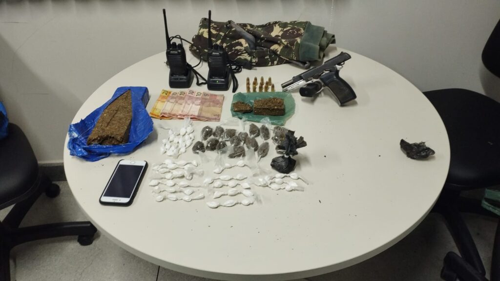 Durante a diligência, foram localizadas e apreendidas substâncias entorpecentes, bem como uma arma de fogo do tipo pistola. Diante da expressiva quantidade de drogas encontradas e da apreensão da arma de fogo, foi dada voz de prisão em flagrante delito aos três indivíduos, os quais foram conduzidos a Delegacia de Polícia.