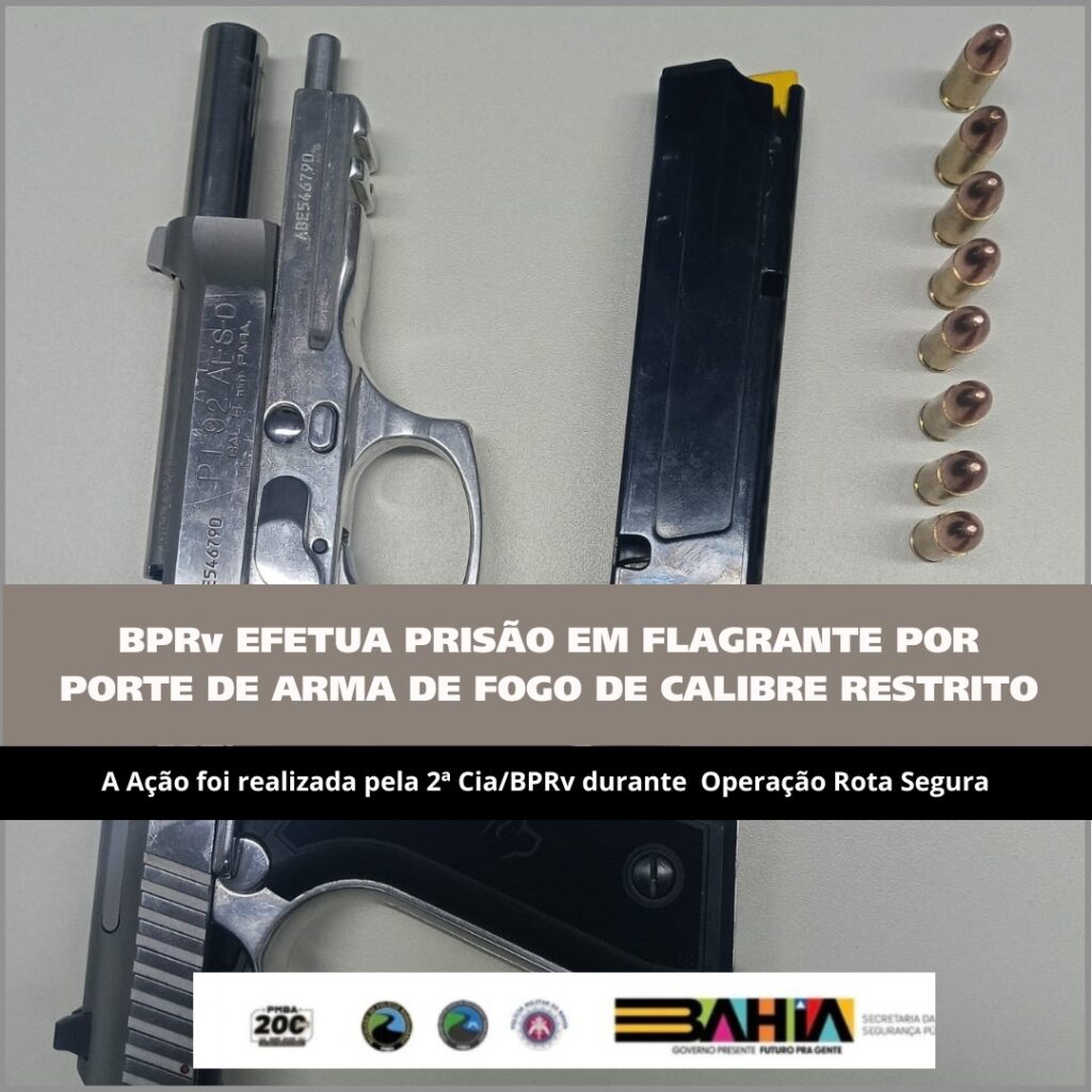 No decorrer da busca veicular, os policiais localizaram, no interior de uma mochila, uma pistola calibre 9mm, municiada, configurando situação de porte ilegal de arma de fogo de calibre restrito. Diante do flagrante, o condutor do veículo recebeu voz de prisão e foi conduzido à Delegacia Territorial de Senhor do Bonfim para adoção das medidas legais cabíveis.