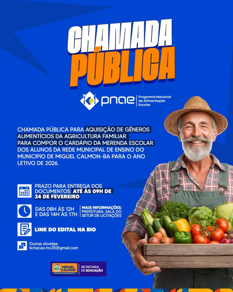 A Prefeitura de Miguel Calmon, por meio da Secretaria Municipal de Educação, convida os agricultores familiares a participarem da chamada pública para fornecimento de gêneros alimentícios que irão compor a merenda escolar da Rede Municipal de Ensino, no ano letivo de 2026.