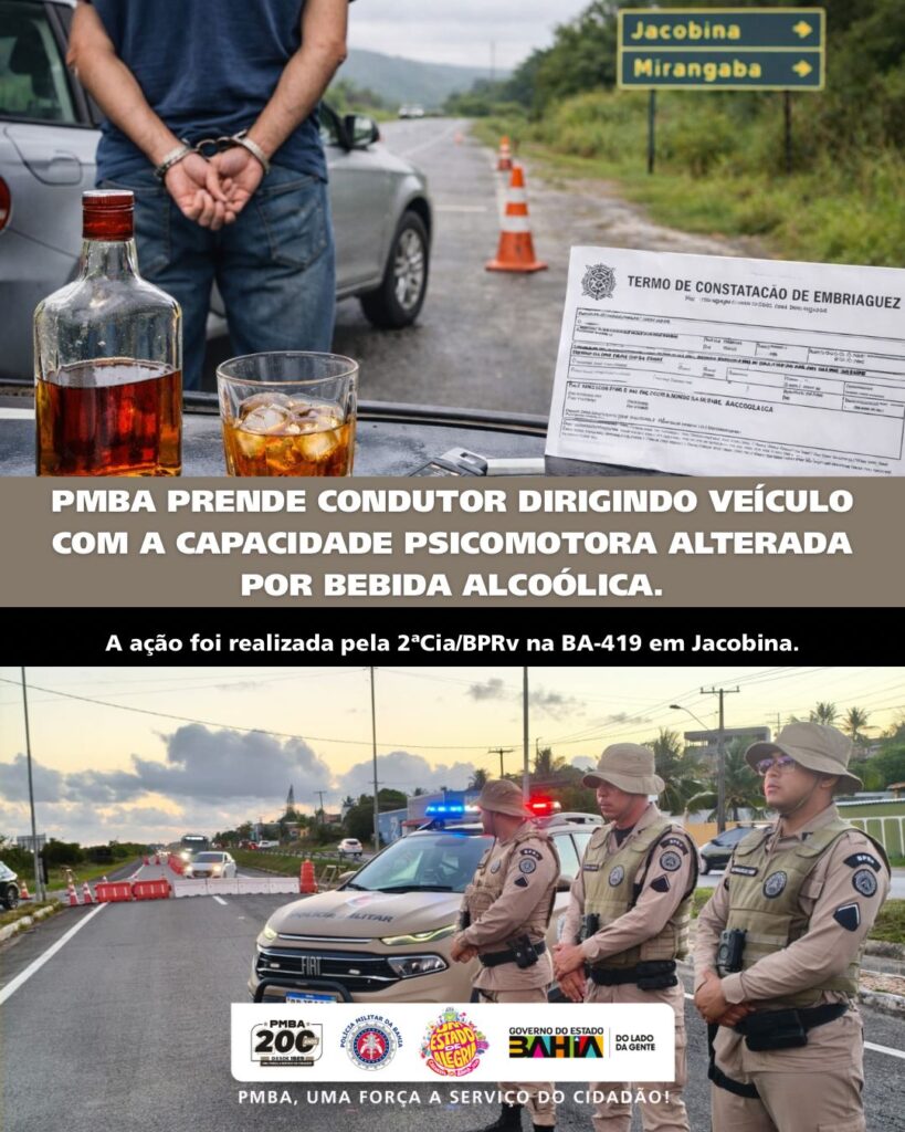 Na manhã desta sexta-feira (13), por volta das 11h00, durante a Operação Carnaval 2026, a 2ª Companhia do Batalhão de Polícia Rodoviária (BPRv) prendeu um condutor por embriaguez ao volante na BR-324, Km 284, entroncamento com a BA-419, no município de Jacobina.