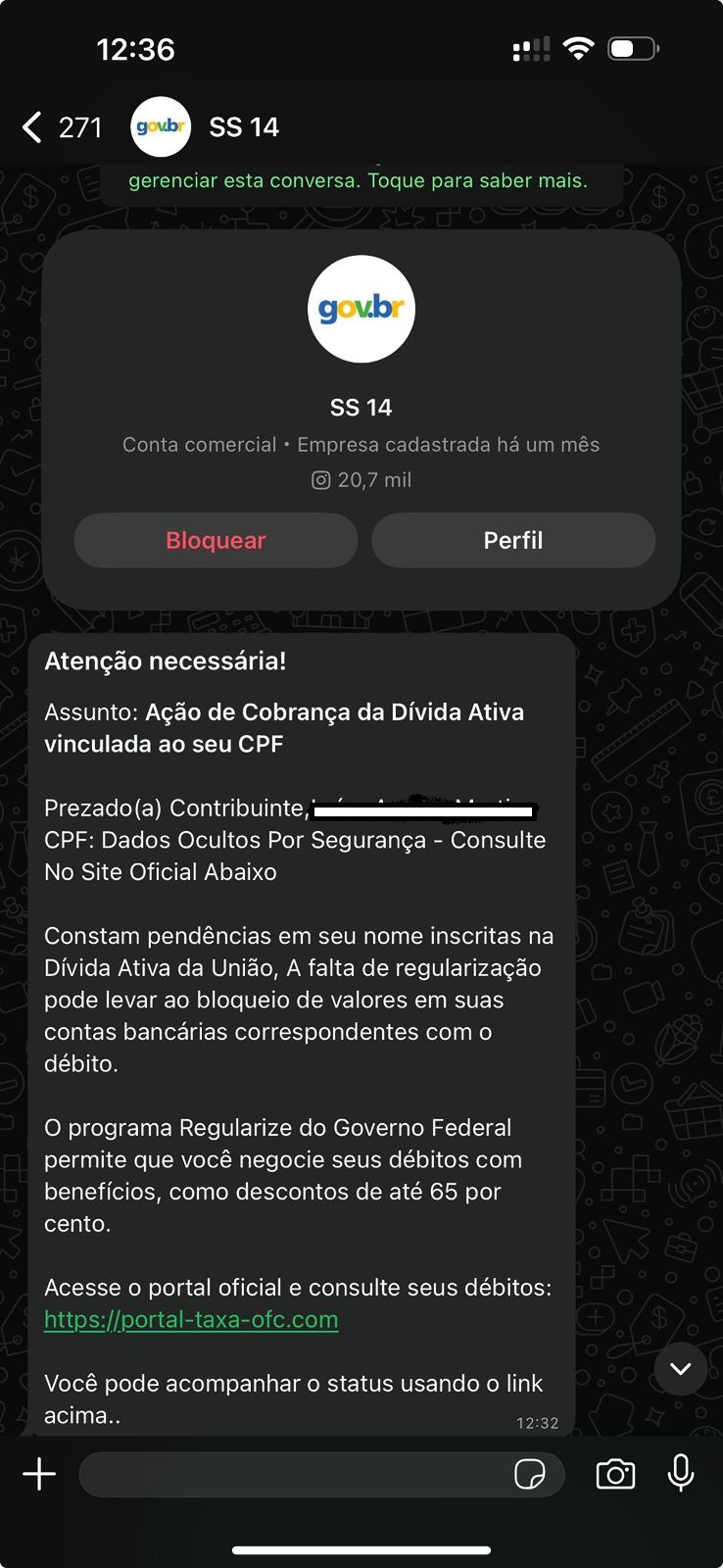 A Contabilidade Abreu faz um alerta importante: alguns clientes têm informado que estão recebendo mensagens via WhatsApp, supostamente enviadas pela Receita Federal (foto acima), solicitando pagamentos, regularizações ou envio de dados.