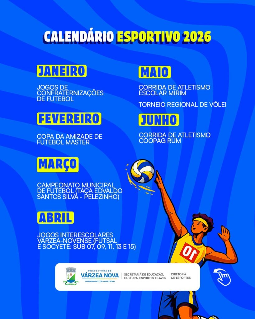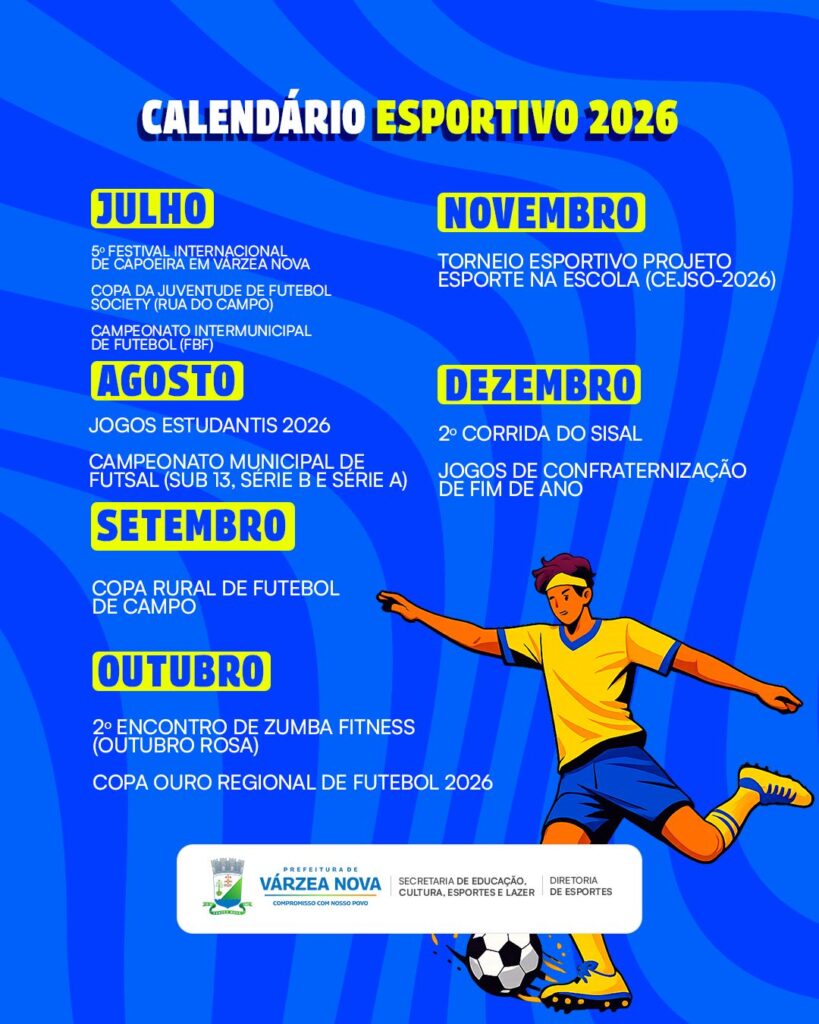 A Prefeitura de Várzea Nova divulgou oficialmente o Calendário Esportivo 2026, marcando um feito inédito na história do município. Pela primeira vez, a cidade passa a contar com um calendário oficial de eventos esportivos, organizado e planejado pela gestão municipal.