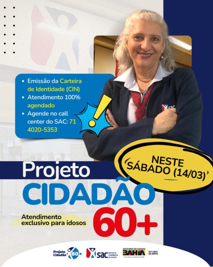 O SAC realiza um atendimento exclusivo para idosos neste sábado (14). O serviço oferecido é somente a nova Carteira de Identidade Nacional (CIN). A ação faz parte da 5ª edição do Projeto Cidadão 60+, que oferece a CIN apenas para o público idoso em postos da rede SAC na capital e Região Metropolitana (RMS), e no interior do Estado, a exemplo de Jacobina. O atendimento será no período da manhã e precisa ser agendado previamente.